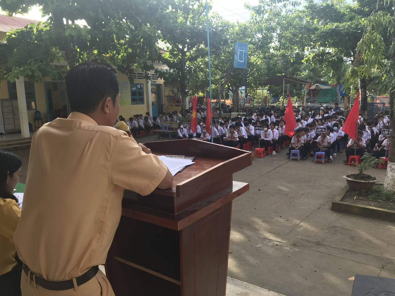 Nhằm giúp học sinh thực hiện tốt công tác an toàn giao thông trong năm học. Sáng ngày 18/9/2023 nhà trường phối hợp với phòng Cảnh sát giáo thông huyện tổ chức buổi tuyên truyền về luật giao thông đường bộ cho các em học sinh nhân dịp sinh hoạt dưới cờ. Buổi tuyên truyền diễn ra thành công, tốt đẹp với sự có mặt của các chiến sĩ Cảnh sát giao thông huyện, lảnh đạo nhà trường, tập thể giáo viên và các em học sinh toàn trường cùng tham dự.